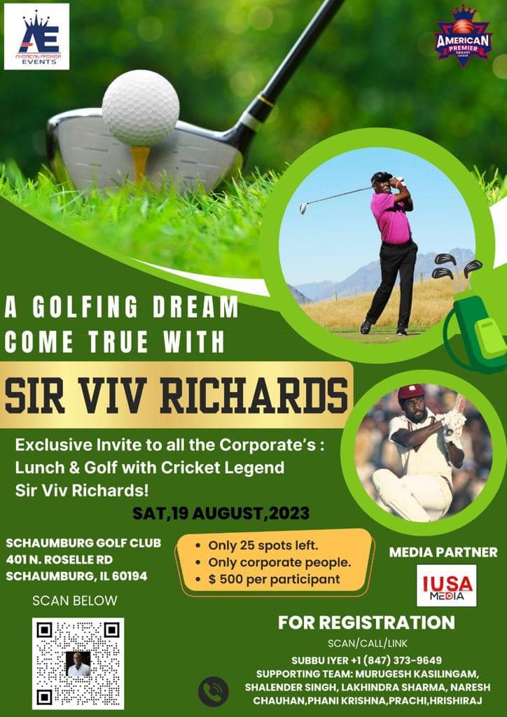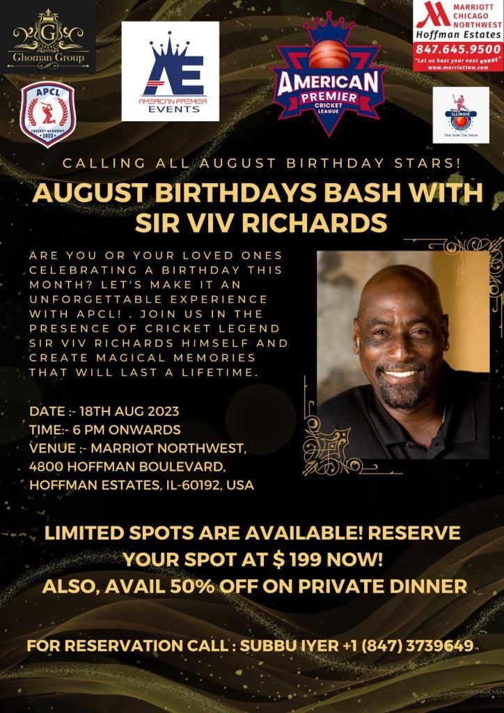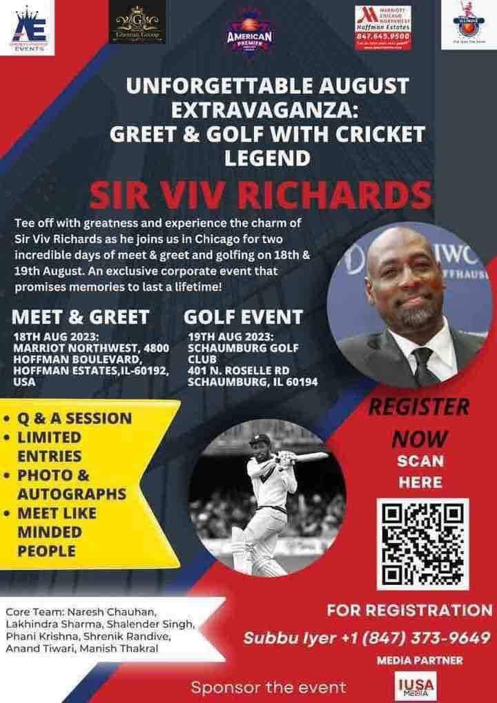 Sir, Vivian Richards, Cricket Hall of famer & former West Indies captain and two time world cup champion (1975 & 1979) will be in Chicago to Launch American Premiere league (APCL) Cricket Academy, Legends visit includes private dinner, Meet & greet event as well as Golfing with the legend.